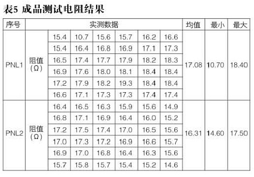 成品測(cè)試電阻如表5所示,2PNL板電阻全部合格,但是相對(duì)于蝕刻的半成品,成品電阻降低了1.5歐姆。