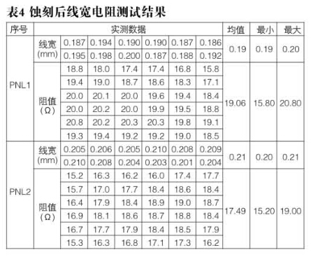 測(cè)試板2PNL,蝕刻得到PNL1線寬均值0.19mm,實(shí)測(cè)相應(yīng)阻值在15.8到19Ω;PNL2線寬均值0.21mm,實(shí)測(cè)相應(yīng)阻值在15.2Ω到17.5Ω。首次作并不確定后流程會(huì)對(duì)電阻造成多大影響,故繼續(xù)跟進(jìn)測(cè)試板到成品后的電阻測(cè)試結(jié)果。