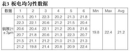 板電銅厚8um,實(shí)際板電后量測(cè)量2PNL板的面銅,量測(cè)后計(jì)算銅厚分布Cpk為1.4>1.33,如表3,板電均勻性比較理想。