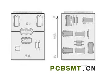 圖4 (左)將數字開關動作和模擬電路隔離,將電路的數字和模擬部分分開。 (右) 要盡可能將高頻和低頻分開,高頻元件要靠近