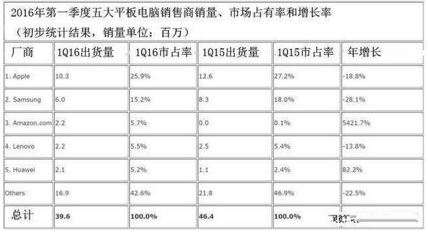 前兩大平板電腦制造商仍然保持著它們的地位:蘋果排在一名,三星排在二名。IDC公司稱,在2016年一季度,全球平板電腦的下滑主要是因為“季節性下滑”和“整體表現冷淡的消費者群體”。前五大平板電腦供應商占全球平板電腦市場57.4%的份額,較去年同期的53.1%所有增長。
