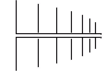 長度漸增的雙極天線組可被普通的饋線饋給,產生一種數組天線,稱為「對數周期雙極數組(log periodic dipole array;LPDA)」,它具有寬帶的特性。典型的電視天線是對數周期的,它利用每一雙極天線之基本的和三共振諧波來涵蓋VHF電視頻道的全部范圍。一個典型的「對數周期雙極數組天線」如下圖所示: