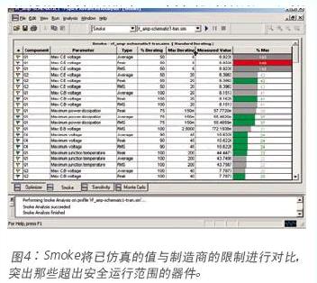 Smoke選項(xiàng)可以對(duì)電能耗散,連接點(diǎn)溫度增加,二次崩潰,或電壓/電流限制違例引起受壓的部件做出預(yù)警,經(jīng)過一定時(shí)間, 這些部件可能導(dǎo)致電路失敗,設(shè)計(jì)師可以用Smoke將電路仿真結(jié)果和部件的安全運(yùn)行限制進(jìn)行對(duì)比,如果超過限制,Smoke 就可以識(shí)別問題參數(shù),使用Smoke分析還可用于創(chuàng)建,修改和配置供使用的decrate 文件,見圖4。