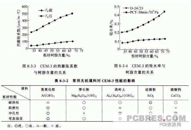 (3)無機(jī)填料無機(jī)填料是CEM-3 的重要組分之一,作為填充劑,它直接影響板材的尺寸穩(wěn)定性、通孔可靠性、耐潮濕性和機(jī)械加工性等。初的CEM-3 不含有無機(jī)填料,玻纖紙的含膠量大,使到板材有機(jī)物(環(huán)氧樹脂固化物)含量高達(dá)60% ,導(dǎo)致板材熱膨脹數(shù)和吸水率偏大,然而早期CEM-3 主要用于單面印制線路板,不需考慮通孔可靠性,耐潮濕性即使差一點(diǎn),問題也不大;隨著CEM-3 應(yīng)用范圍的擴(kuò)大,特別是在雙面印制線路板上的應(yīng)用,這些問題就暴露出來。后來,通過在芯料用膠液中加入無機(jī)填料,大大提高CEM-3的無機(jī)物比例,使板材中有機(jī)物含量和無機(jī)物含量的比例下降為40: 60 (質(zhì)量份) ,接近FR-4 水平,顯著地降低板材的熱膨脹系數(shù)和吸水率,圖8-3-3 、圖8-3-4 顯示了CEM-3 的樹脂含量(即有機(jī)物含量,通過無機(jī)填料用量來調(diào)整)與板材熱膨脹系數(shù)、吸水率的關(guān)系。CEM-3 常用的元機(jī)填料有氫氧化鋁、滑石粉、碳酸鈣、硅微粉、高嶺土等,它們對CEM-3 性能的影響見表8-3-2 。目前CEM-3 大量使用的無機(jī)填料是氫氧化鋁,氫氧化鋁含有3 個(gè)結(jié)晶水,在200 - 500 C條件下,不同程度釋放出水,在釋放水時(shí),需吸收大量的熱量,所以氫氧化鋁也是一種理想的"潔凈"阻燃劑,氫氧化鋁的粒徑越小,阻燃效果越好;但是,氫氧化鋁會影響板材的耐熱性、耐浸焊性, PCB 加工熱風(fēng)整平、元件焊接的溫度都接近氫氧化鋁的分解溫度,如果時(shí)間較長,高溫下氫氧化鋁受熱分解,板材會分層起泡;近年有廠家研究對氫氧化鋁進(jìn)行熱處理,脫去部分在200 多度開始分解的結(jié)晶水,可大大提高氫氧化鋁的熱分解溫度,這種含有1. 8-2.9 個(gè)結(jié)晶水的氫氧化鋁已開始供應(yīng)市場。