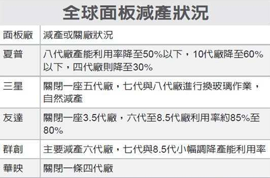 以目前減產幅度大的夏普來看,旗下龜山八代廠11月開始停止生產32寸電視面板,目前產能利用率低于50%,旗下堺市10代廠主要生產60寸面板,因為受到55及65寸面板夾殺,產能利用率僅60%,位在三重的4.5代廠,因中市場訂單萎縮,產能利用率也僅三成左右。